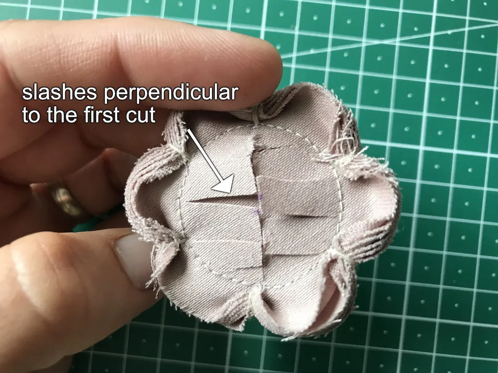 Make perpendicular slashes to the cut you have made already. Make several slashes creating about 3 – 4 mm (0 1/8 inch) wide stripes of fabric. Cut close to the stitching; again be careful not to cut into the stitching.